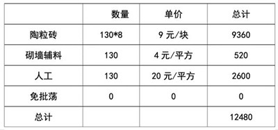 外墻陶粒磚400x200x200作為外墻,大約12.5塊一平方,需要3187.5塊,一塊大概12元,總共3187.5x12=38250元,內墻采用600*200*100作為內墻,大約8塊一平方,一塊大概9元,總共130x8x9=9360元(不考慮磨損),人工一平方30塊,255平7650,內墻20塊一平方,130平2600元,砌墻人工費共10250元,塊輔材外墻8塊一平方,總輔材2040元,內墻4塊一平方,總共520元,總計:38250+9360+7650+2600+2040+520=60420元。