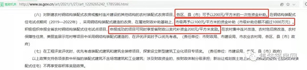 新建農村鋼結構裝配式農房或整村連片建設的其他結構的農村裝配式農房項目,200元/平方米的資金補助,市級再予以100元/平方米的資金補助,申報成功的項目可同時享受省財政以獎代補資金200元/平方米獎勵,合計可達500元/平方米的資金補助。